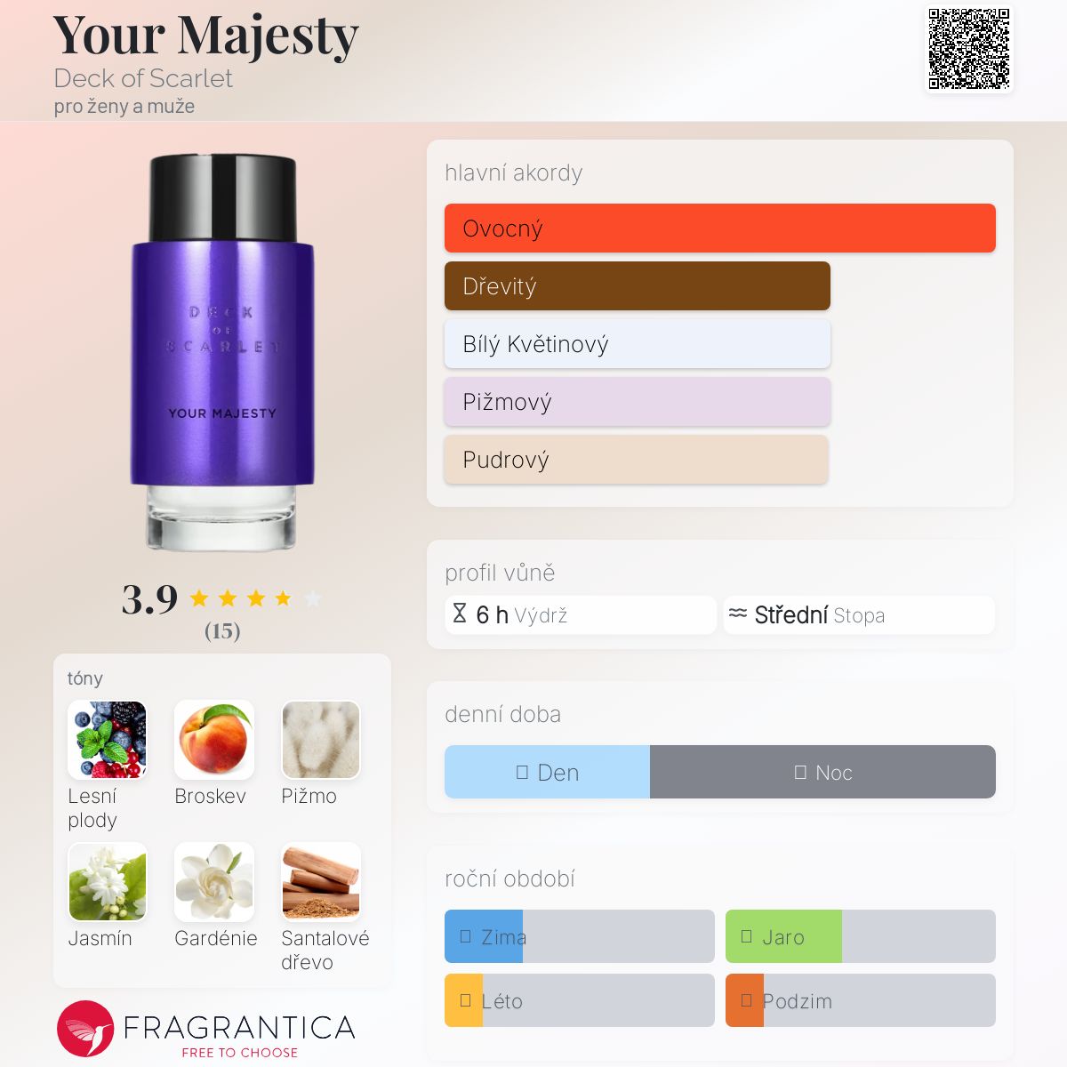 Your Majesty podle Deck of Scarlet je Floral Woody Musk vůně pro ženy a muže. Toto je nová vůně. Your Majesty byl/a uveden/a v roce 2024. Vrchní tóny jsou Lesní plody a Broskev; střední tóny jsouJasmín a Gardénie ; základní tóny jsou Pižmo, Santalové dřevo a Jantar (ambra).