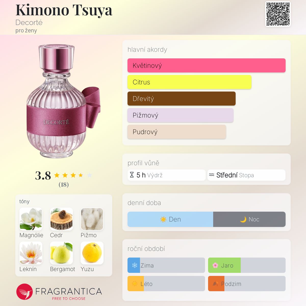 Kimono Tsuya podle Decorté je Floral vůně pro ženy. Kimono Tsuya byl/a uveden/a v roce 2021. "Nosem" za touto vůní je Paul Guerlain. Vrchní tóny jsou Leknín, Bergamot a Yuzu; střední tóny jsouMagnólie, Pivoňka a Růže ; základní tóny jsou Cedr, Pižmo a Jantar (ambra).