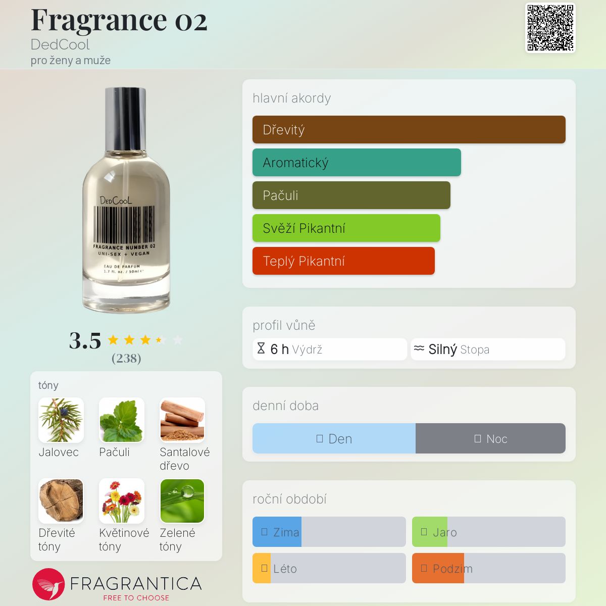 Fragrance 02 podle DedCool je Woody Aromatic vůně pro ženy a muže. Fragrance 02 byl/a uveden/a v roce 2018. "Nosem" za touto vůní je Carina Chaz. Vrchní tón je Jalovec ; střední tóny jsouPačuli, Dřevité tóny, Květinové tóny a Zelené tóny ; základní tón je Santalové dřevo.