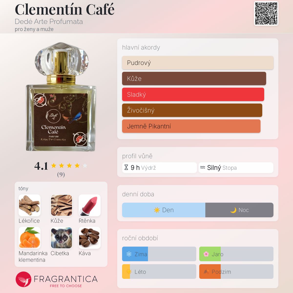 Clementín Café podle Dedé Arte Profumata je Floral Woody Musk vůně pro ženy a muže. Toto je nová vůně. Clementín Café byl/a uveden/a v roce 2024. "Nosem" za touto vůní je Denise Meles. Vrchní tóny jsou Lékořice, Mandarinka klementina, Borůvky, Kmín a Koriandr; střední tóny jsouKůže, Rtěnka, Turecká růže, Pudrové tóny, Tabák, Káva, Vanilka a Dřevité tóny ; základní tóny jsou Pačuli, Cibetka, Jantar (ambra), Santalové dřevo, Dubový mech, Labdanum a Vetiver.