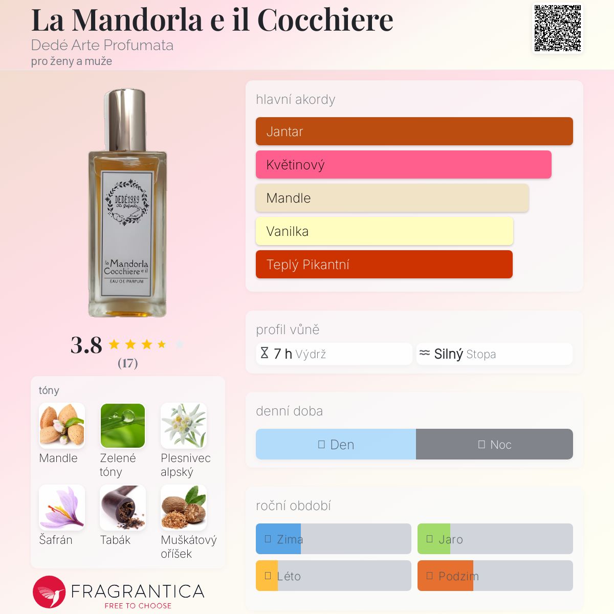 La Mandorla e il Cocchiere podle Dedé Arte Profumata je vůně pro ženy a muže. La Mandorla e il Cocchiere byl/a uveden/a v roce 2023. "Nosem" za touto vůní je Denise Meles. Vrchní tóny jsou Mandle, Zelené tóny, Šafrán a Muškátový oříšek; střední tóny jsouMandle, Plesnivec alpský, Tabák, Mléko, Otočník, Třešňový květ a Vanilka ; základní tóny jsou Kaštan, Peruánský balzám, Včelí vosk, Santalové dřevo, Jantar (ambra), Fazole tonka a Styrax.