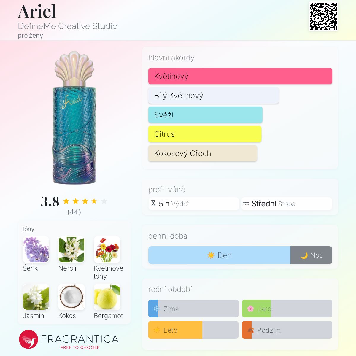 Ariel podle DefineMe Creative Studio je Orientální Floral vůně pro ženy. Ariel byl/a uveden/a v roce 2020. Vrchní tóny jsou Neroli a Bergamot; střední tóny jsouŠeřík, Květinové tóny a Jasmín ; základní tóny jsou Kokos, Naplavené dříví a Fazole tonka.