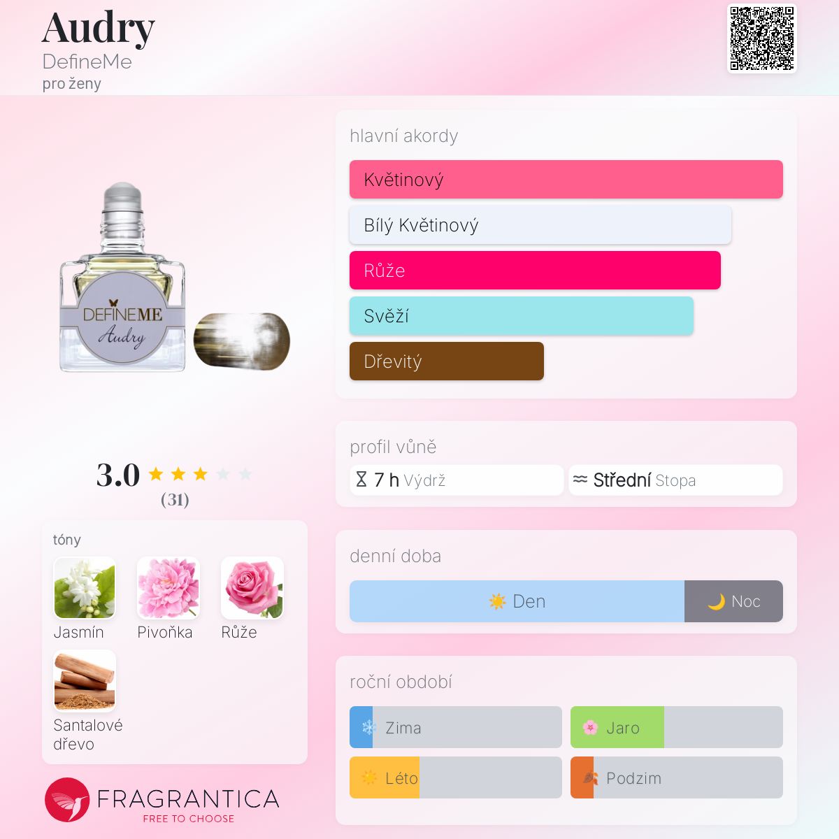 Audry podle DefineMe je Floral vůně pro ženy. Audry byl/a uveden/a v roce 2015. "Nosem" za touto vůní je Jennifer McKay Newton.
