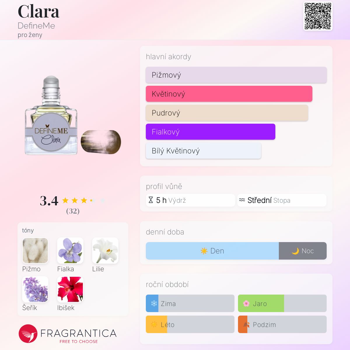 Clara podle DefineMe je Floral vůně pro ženy. Clara byl/a uveden/a v roce 2015. "Nosem" za touto vůní je Jennifer McKay Newton.