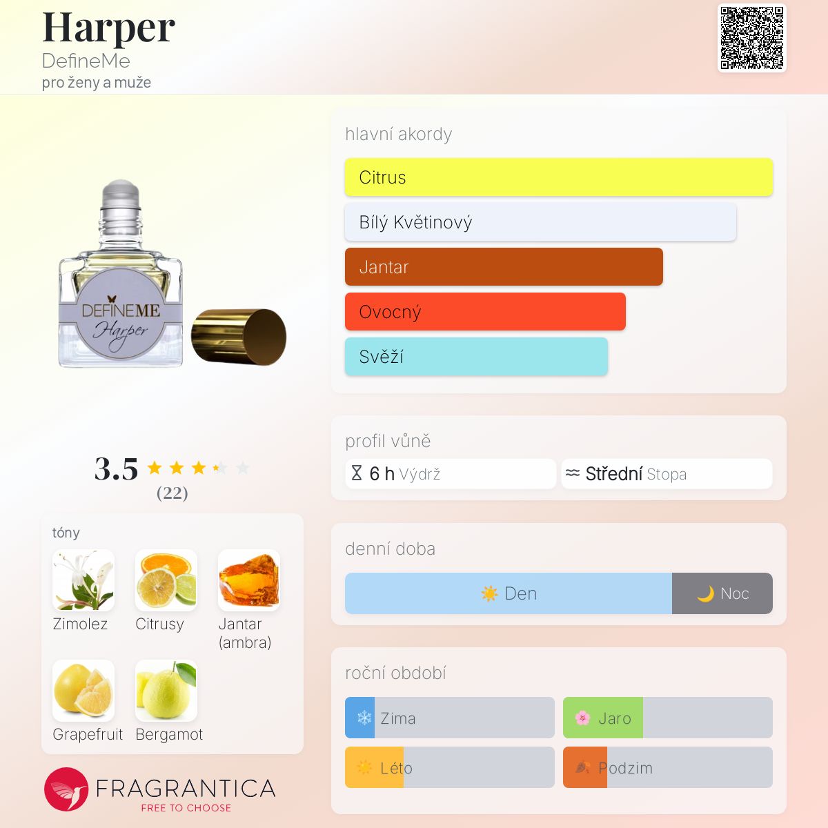 Harper podle DefineMe je Citrus vůně pro ženy a muže. Harper byl/a uveden/a v roce 2015. "Nosem" za touto vůní je Jennifer McKay Newton.