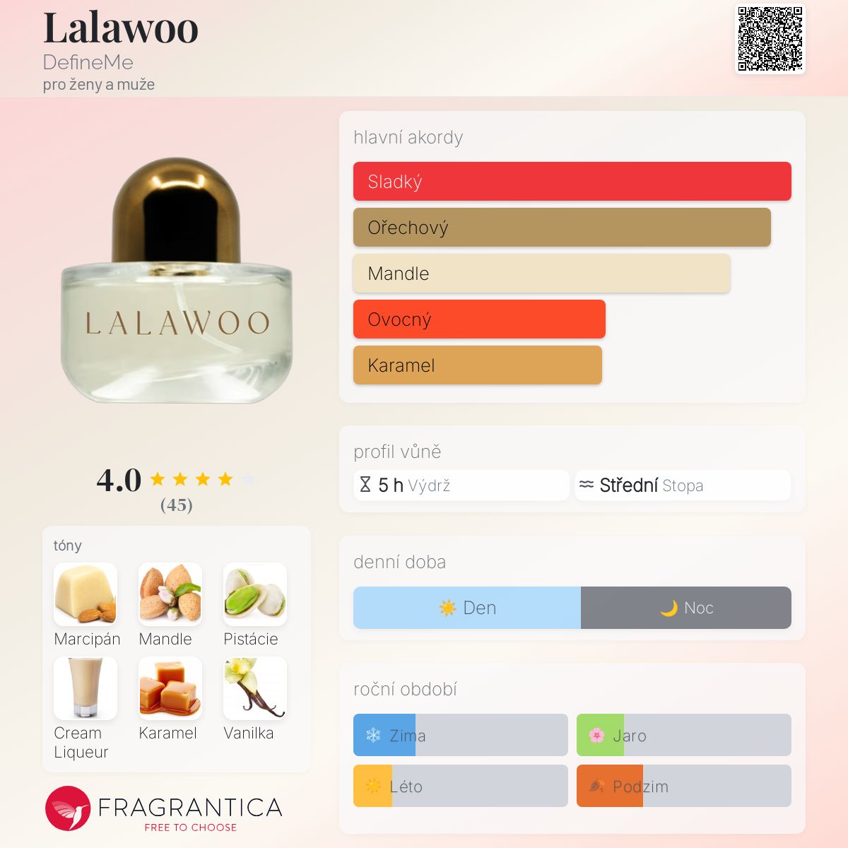 Lalawoo podle DefineMe je vůně pro ženy a muže. Toto je nová vůně. Lalawoo byl/a uveden/a v roce 2024. Vrchní tóny jsou Marcipán a Pistácie; střední tóny jsouMandlové mléko, Karamel a Pralinka ; základní tóny jsou Smetanový likér a Vanilkový lusk.