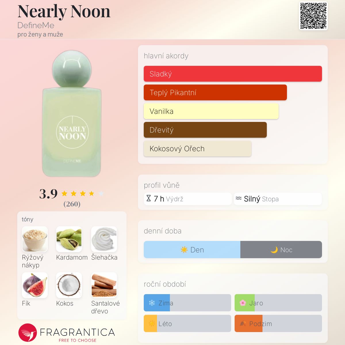 Nearly Noon podle DefineMe je vůně pro ženy a muže. Toto je nová vůně. Nearly Noon byl/a uveden/a v roce 2024. Nearly Noon byl/a vytvořen/a Dominique Bouley a Pierre Bouley. Vrchní tóny jsou Kardamom, Šlehačka a Fíkový nektar; střední tóny jsouRýžový nákyp, Kokos a Šafrán ; základní tóny jsou Santalové dřevo, Vanilkový lusk a Jantarové dřevo.