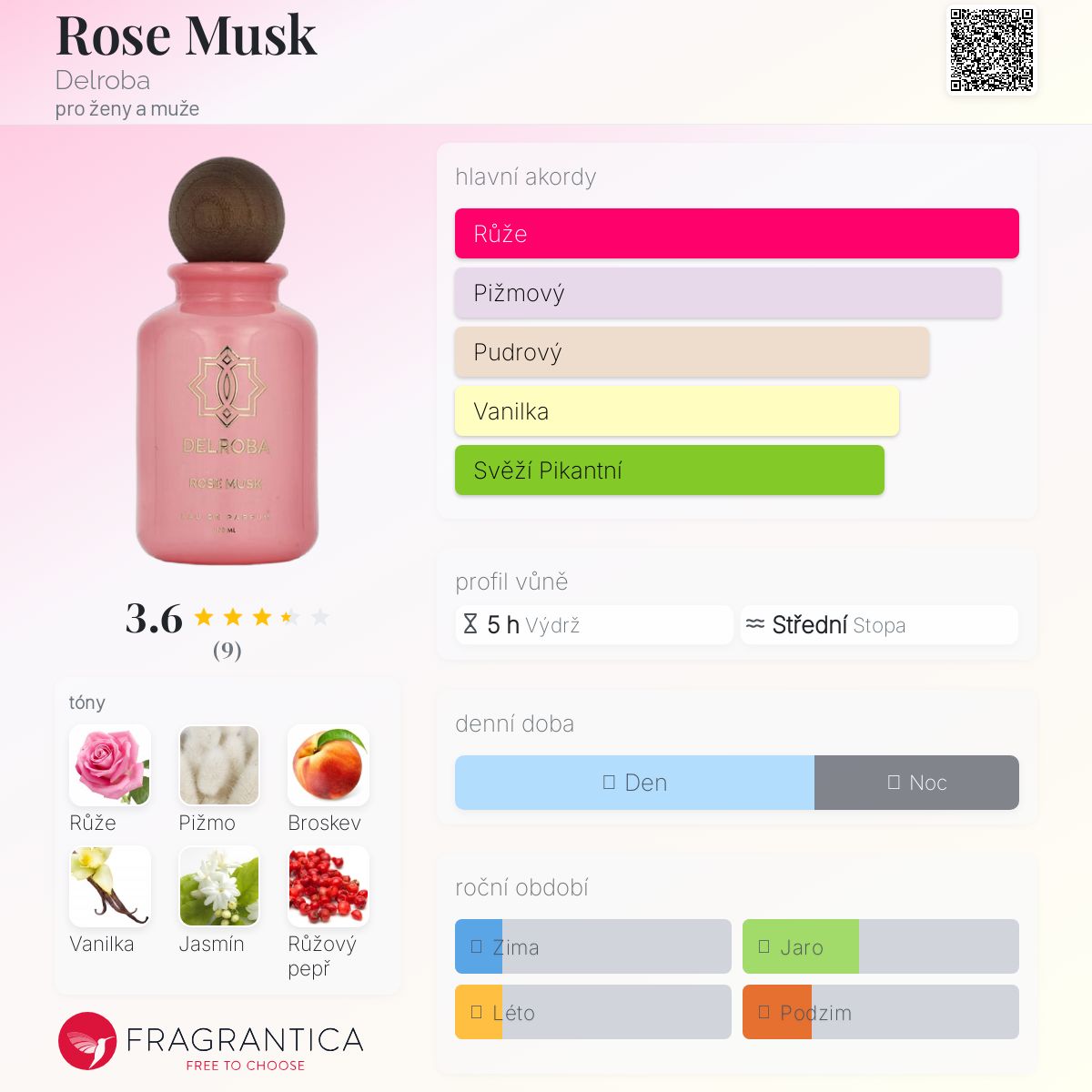 Rose Musk podle Delroba je Floral vůně pro ženy a muže. Vrchní tóny jsou Růže, Broskev, Bergamot, Grapefruit a Olibanum; střední tóny jsouJasmín, Růžový pepř, Levandule a Pelargónie ; základní tóny jsou Pižmo, Vanilka, Fazole tonka, Jantar (ambra) a Mech.
