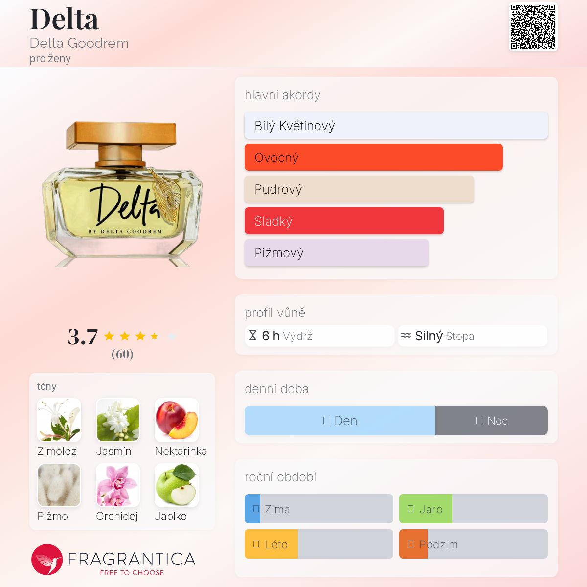 Delta podle Delta Goodrem je Floral Fruity vůně pro ženy. Delta byl/a uveden/a v roce 2017. Vrchní tóny jsou Nektarinka, Zelené jablko a Mandarinka; střední tóny jsouZimolez, Jasmín a Divoká orchidej ; základní tóny jsou Bílé pižmo, Santalové dřevo a Vanilka.
