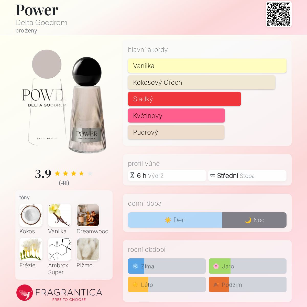 Power podle Delta Goodrem je Floral Woody Musk vůně pro ženy. Power byl/a uveden/a v roce 2023. Vrchní tóny jsou Kokos, Frézie a Lilie; střední tóny jsouDreamwood, Ambrox Super a Jasmín ; základní tóny jsou Vanilka, Pižmo a Cedr.