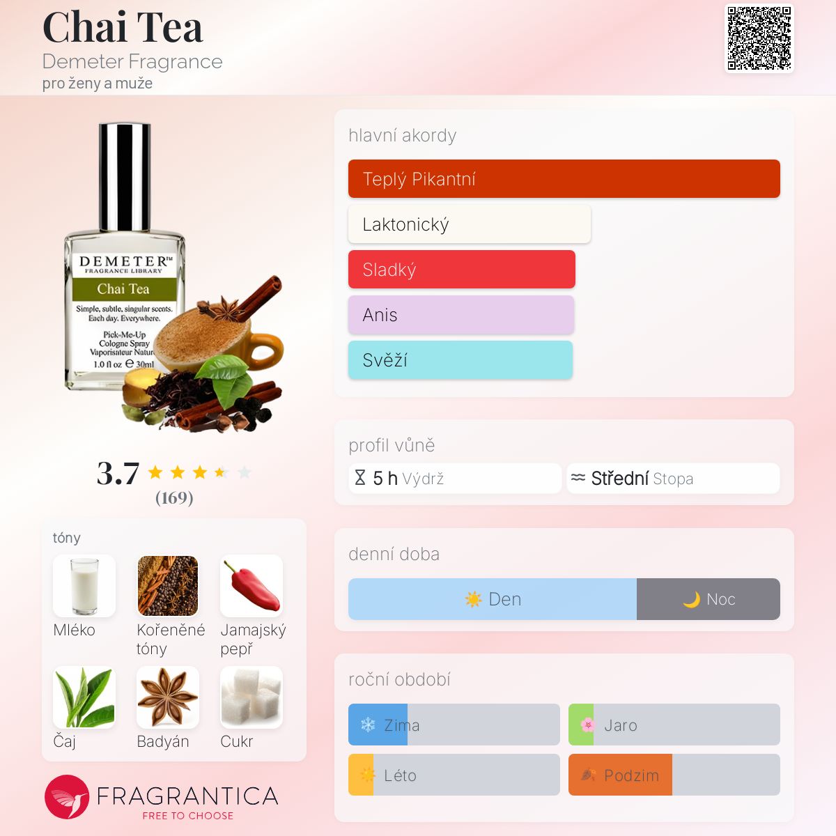 Chai Tea podle Demeter Fragrance je Aromatic Spicy vůně pro ženy a muže. Chai Tea byl/a uveden/a v roce 2009. Vrchní tóny jsou Koření a Zelené tóny; střední tóny jsouPaprika, Badyán, Skořice, Kardamom, Hřebíček a Zázvor ; základní tóny jsou Mléko, Čaj a Cukr.