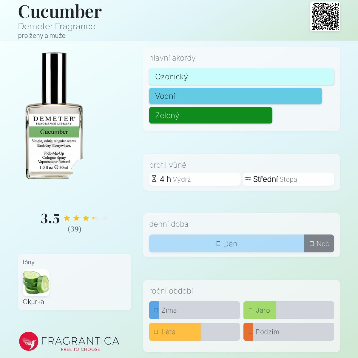 Cucumber podle Demeter Fragrance je Aromatic vůně pro ženy a muže. Cucumber byla spuštěna během 2000.