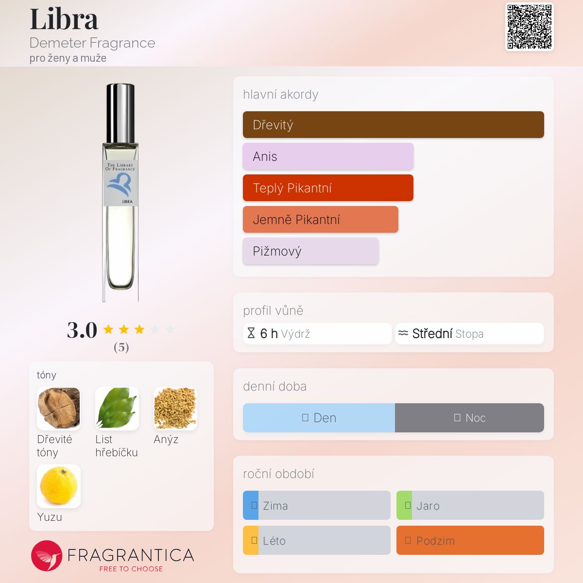 Libra podle Demeter Fragrance je Woody Spicy vůně pro ženy a muže. Libra byl/a uveden/a v roce 2015.