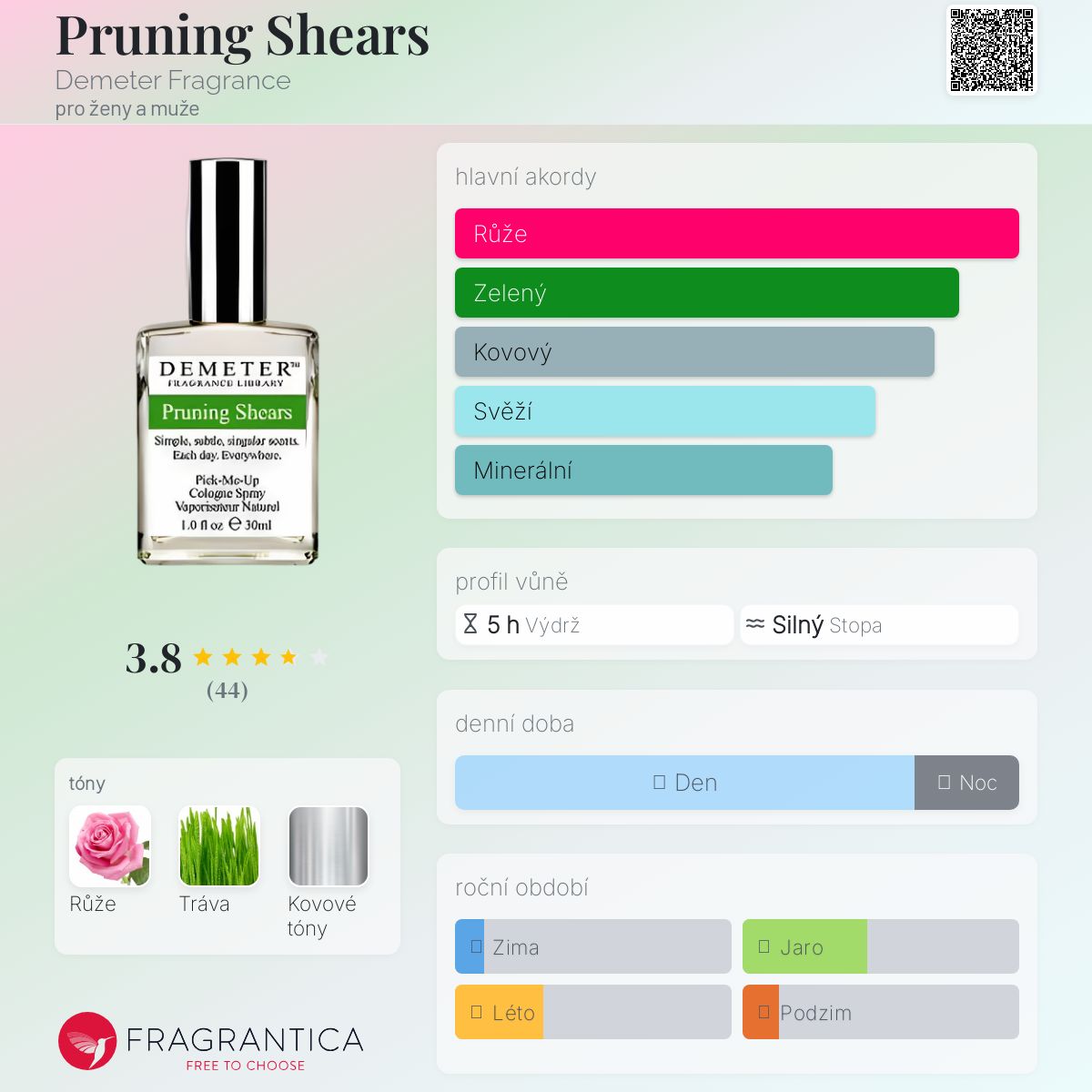 Pruning Shears podle Demeter Fragrance je Floral Green vůně pro ženy a muže. Pruning Shears byl/a uveden/a v roce 1998. "Nosem" za touto vůní je Francis Kurkdjian.