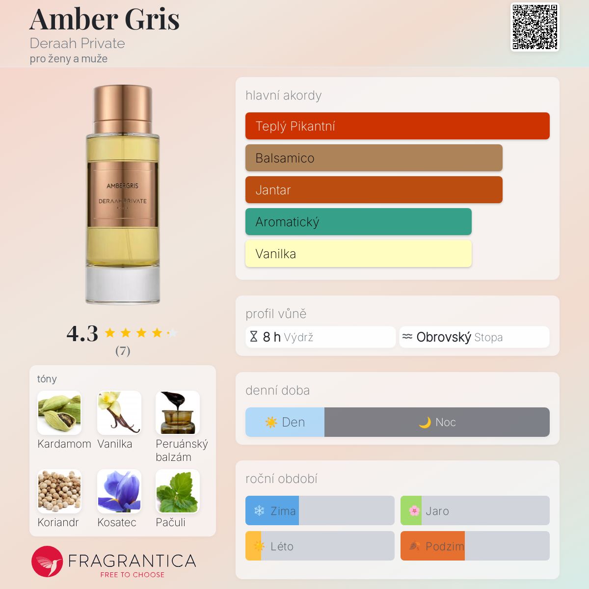 Amber Gris podle Deraah Private je vůně pro ženy a muže. Toto je nová vůně. Amber Gris byl/a uveden/a v roce 2024. Vrchní tóny jsou Kardamom, SP3 Carbon, Růžový pepř a Bergamot; střední tóny jsouVanilka, Koriandr a Kosatec ; základní tóny jsou Peruánský balzám, Pačuli, Kůže a Ambroxan.