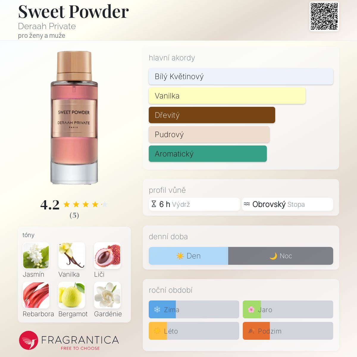 Sweet Powder podle Deraah Private je Floral vůně pro ženy a muže. Sweet Powder byl/a uveden/a v roce 2022. Sweet Powder byl/a vytvořen/a Philippine Courtière a Emilie Coppermann. Vrchní tóny jsou Liči, Rebarbora a Bergamot; střední tóny jsouJasmín, Gardénie a Růže ; základní tóny jsou Vanilka, Cedr, Pižmo, Vetiver a Kadidlo.