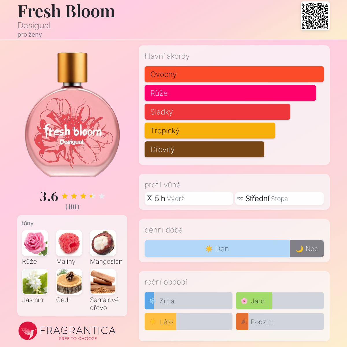 Fresh Bloom podle Desigual je Floral Fruity vůně pro ženy. Fresh Bloom byl/a uveden/a v roce 2017. Fresh Bloom byl/a vytvořen/a Violaine Collas a Veronique Nyberg. Vrchní tóny jsou Maliny a Mangostan; střední tóny jsouRůže májová a Jasmín Sambac ; základní tóny jsou Cedr a Santalové dřevo.