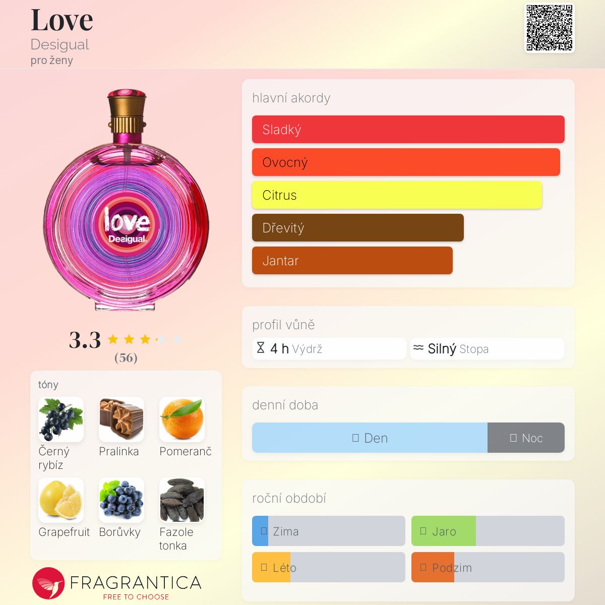 Love podle Desigual je Floral Fruity Gourmand vůně pro ženy. Love byl/a uveden/a v roce 2014. "Nosem" za touto vůní je Fabrice Pellegrin. Vrchní tóny jsou Černý rybíz a Borůvky; střední tóny jsouPomeranč, Grapefruit a Benzoin ; základní tóny jsou Pralinka, Fazole tonka a Santalové dřevo.