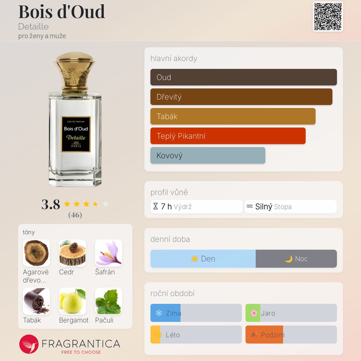 Bois d'Oud podle Detaille je Orientální Woody vůně pro ženy a muže. Bois d'Oud byl/a uveden/a v roce 2014. Vrchní tóny jsou Agarové dřevo (oud), Bergamot a Labdanum; střední tóny jsouCedr a Šafrán ; základní tóny jsou Agarové dřevo (oud), Cedr, Tabák a Pačuli.