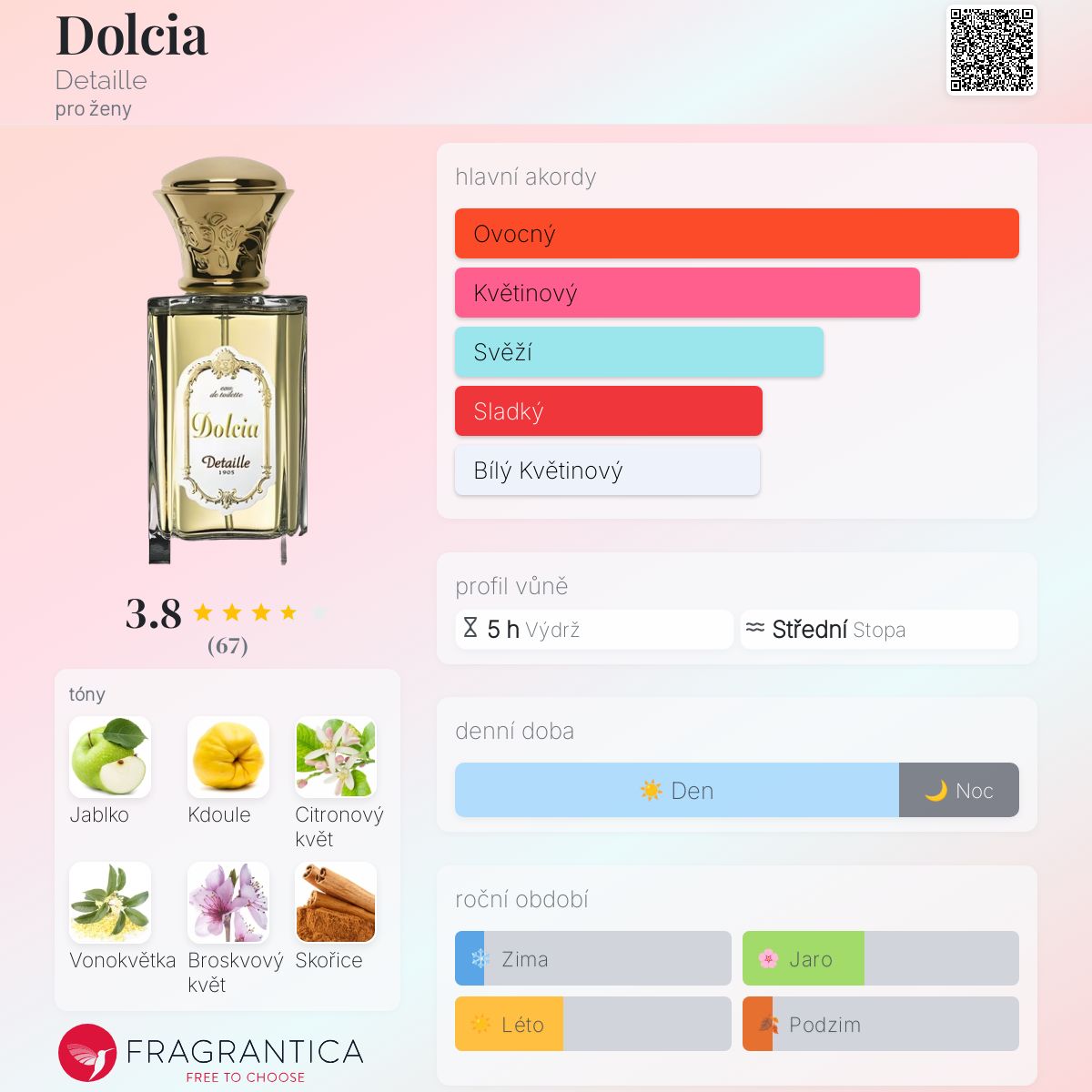 Dolcia podle Detaille je Floral Fruity vůně pro ženy. Vrchní tóny jsou Granny Smith jablko a Kdoule; střední tóny jsouCitronový květ, Broskvový květ, Skořice a Karafiát ; základní tóny jsou Vonokvětka, Virginský cedr a Jantar (ambra).