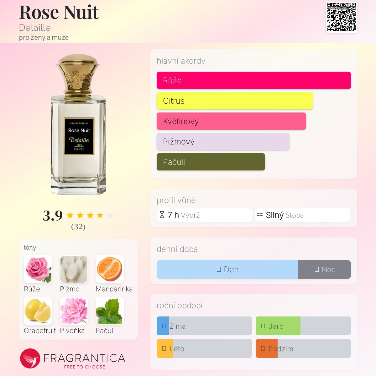 Rose Nuit podle Detaille je Orientální Floral vůně pro ženy a muže. Rose Nuit byl/a uveden/a v roce 2014. Vrchní tóny jsou Mandarinka a Grapefruit; střední tóny jsouRůže, Pivoňka a Vonokvětka ; základní tóny jsou Bílé pižmo a Pačuli.