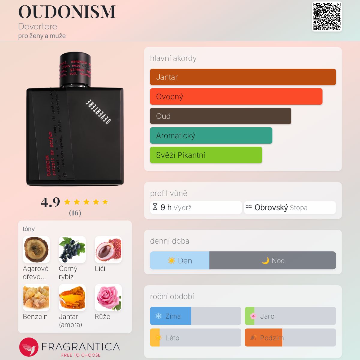 OUDONISM podle Devertere je Orientální Woody vůně pro ženy a muže. Toto je nová vůně. OUDONISM byl/a uveden/a v roce 2025. "Nosem" za touto vůní je Sofia Bardelli. Vrchní tóny jsou Černý rybíz, Liči, Mandle, Růžový pepř a Aksamitník; střední tóny jsouRůže, Styrax, Elimi, Šafrán a Jalovec ; základní tóny jsou Agarové dřevo (oud), Benzoin, Jantar (ambra), Pižmo, Kůže a Cypriolový olej.