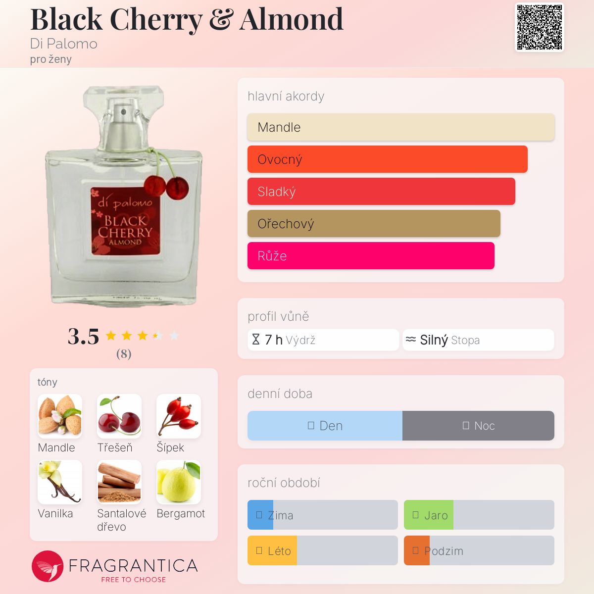 Black Cherry & Almond podle Di Palomo je vůně pro ženy. Black Cherry & Almond byla spuštěna během 2000. Vrchní tóny jsou Třešeň, Šípek a Bergamot; střední tóny jsouMandle, Frézie a Růžový pepř ; základní tóny jsou Vanilka, Santalové dřevo, Jantar (ambra) a Pižmo.