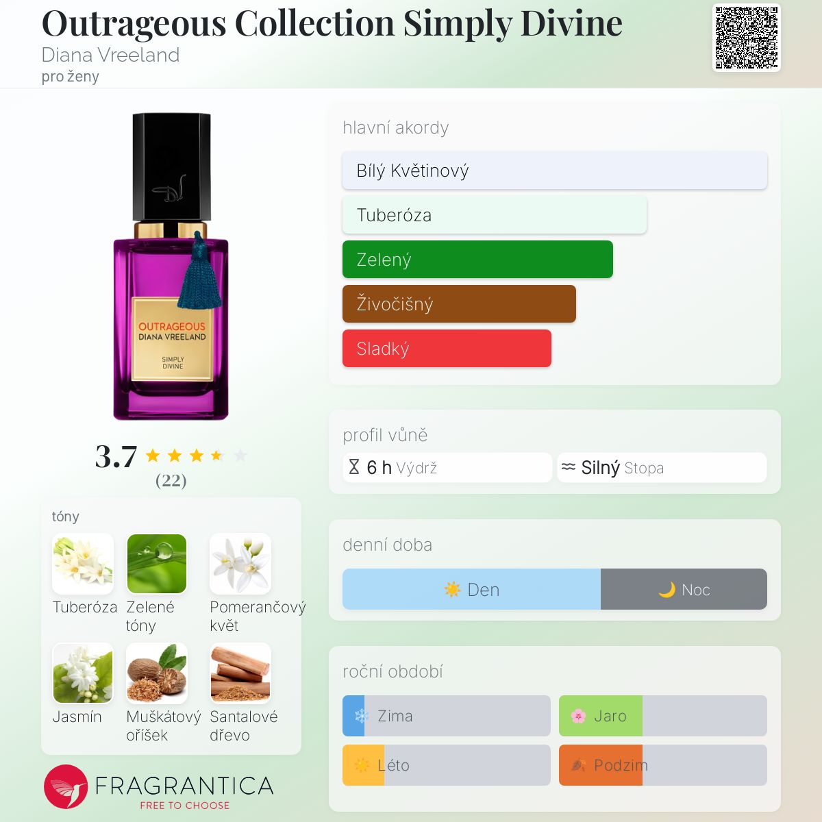 Outrageous Collection Simply Divine podle Diana Vreeland je Floral vůně pro ženy. Outrageous Collection Simply Divine byl/a uveden/a v roce 2016. "Nosem" za touto vůní je Clement Gavarry. Vrchní tóny jsou Zelené listí a Muškátový oříšek; střední tóny jsouTuberóza, Pomerančový květ a Jasmín ; základní tóny jsou Santalové dřevo, Kašmírové pižmo, Fazole tonka a Pižmo.
