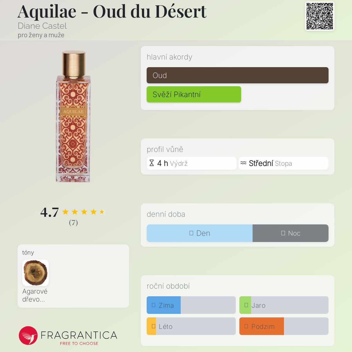 Aquilae - Oud du Désert podle Diane Castel je vůně pro ženy a muže. Aquilae - Oud du Désert byl/a uveden/a v roce 2020. základní tón je Agarové dřevo (oud).