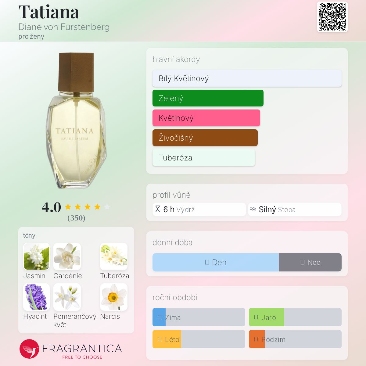 Tatiana podle Diane von Furstenberg je Floral vůně pro ženy. Tatiana byl/a uveden/a v roce 1975. "Nosem" za touto vůní je James Bell. Vrchní tóny jsou Hyacint, Květ afrického pomeranče a Bergamot; střední tóny jsouJasmín, Gardénie, Tuberóza, Narcis a Růže ; základní tóny jsou Pižmo, Jantar (ambra), Santalové dřevo a Cibetka.