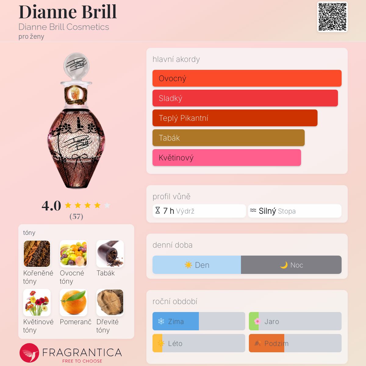 Dianne Brill podle Dianne Brill Cosmetics je Woody Spicy vůně pro ženy. Dianne Brill byl/a uveden/a v roce 2008. "Nosem" za touto vůní je Valerie Garnuch-Mentzel.