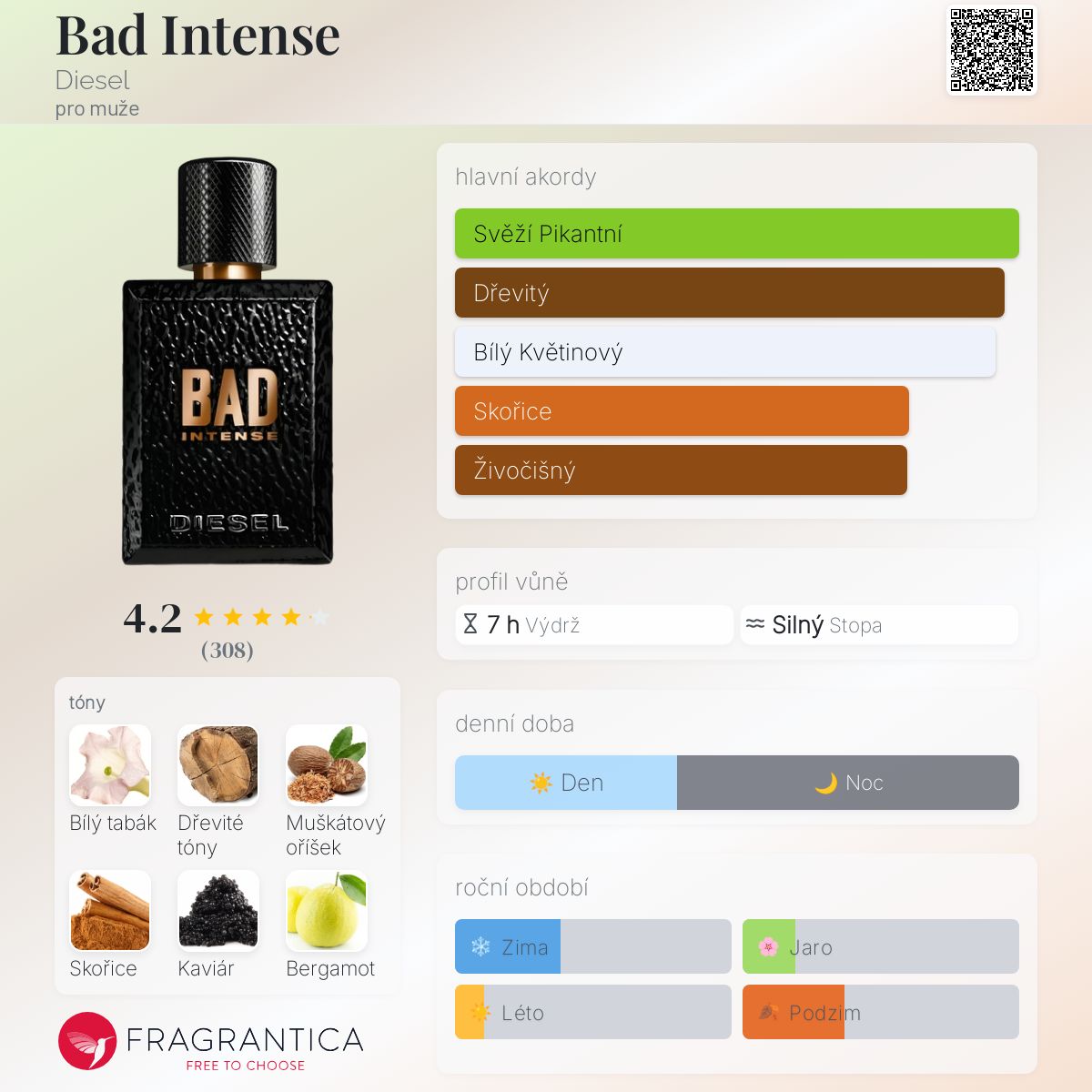 Bad Intense podle Diesel je Woody Spicy vůně pro muže. Bad Intense byl/a uveden/a v roce 2017. Vrchní tóny jsou Muškátový oříšek, Skořice a Bergamot; střední tón jeKaviár ; základní tóny jsou Bílý tabák a Dřevité tóny.