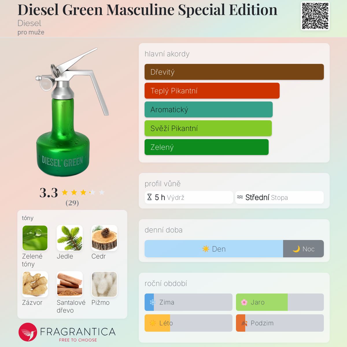 Diesel Green Masculine Special Edition podle Diesel je Woody Aromatic vůně pro muže. Diesel Green Masculine Special Edition byl/a uveden/a v roce 2003. "Nosem" za touto vůní je Arturetto Landi. Vrchní tóny jsou Zelené listí, Jedle, Pomeranč a Mandarinka; střední tóny jsouZázvor, Karafiát, Pelargónie, Brambořík a Orchidej ; základní tóny jsou Cedr, Santalové dřevo a Pižmo.