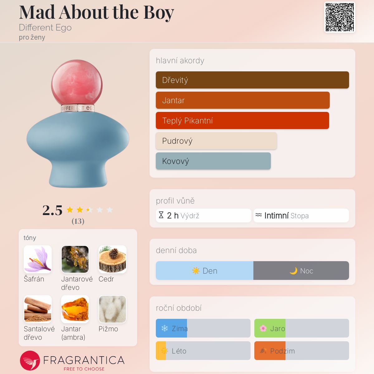Mad About the Boy podle Different Ego je Orientální Floral vůně pro ženy. Toto je nová vůně. Mad About the Boy byl/a uveden/a v roce 2025. Vrchní tóny jsou Šafrán, Krvavý pomeranč a Mandarinka; střední tóny jsouJantarové dřevo, Jasmín a Bílé květy ; základní tóny jsou Cedr, Santalové dřevo, Jantar (ambra) a Pižmo.