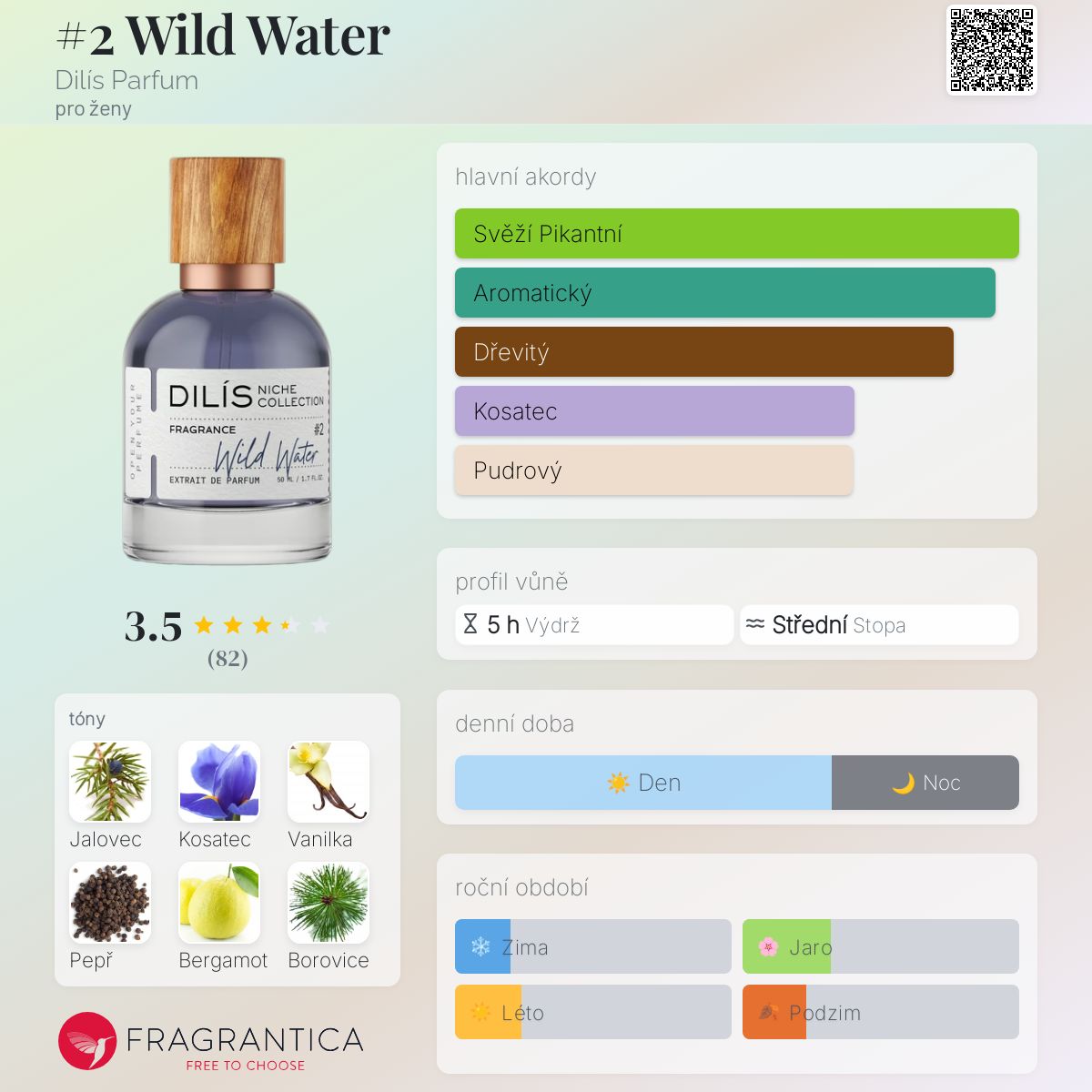 #2 Wild Water podle Dilís Parfum je Woody vůně pro ženy. #2 Wild Water byl/a uveden/a v roce 2023. Vrchní tóny jsou Jalovec, Černý pepř a Bergamot; střední tóny jsouKosatec, Jehličí borovice a Černý rybíz ; základní tóny jsou Vanilka, Borovice a Jantar (ambra).