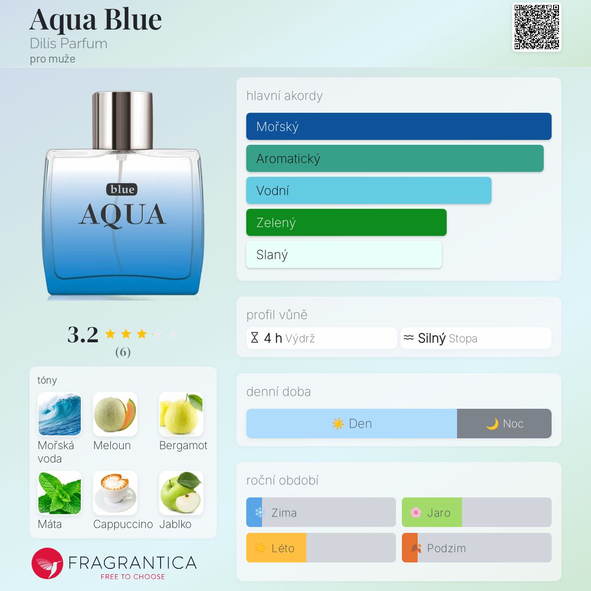 Aqua Blue podle Dilís Parfum je Orientální Fougere vůně pro muže. Aqua Blue byl/a uveden/a v roce 2010. Vrchní tóny jsou Meloun, Bergamot, Máta a Černý rybíz; střední tóny jsouMořská voda, Cappuccino, Zelené jablko, Kardamom a Muškátový oříšek ; základní tóny jsou Dřevité tóny a Jantar (ambra).