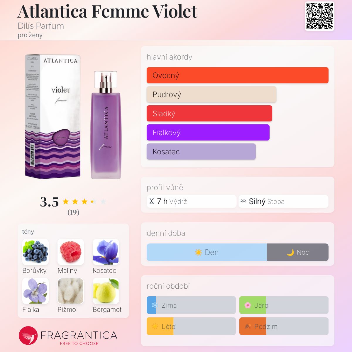 Atlantica Femme Violet podle Dilís Parfum je Floral Fruity vůně pro ženy. Atlantica Femme Violet byl/a uveden/a v roce 2015. Vrchní tóny jsou Borůvky a Bergamot; střední tóny jsouMaliny, Fialka a Růže ; základní tóny jsou Kosatec, Pižmo a Černý rybíz.