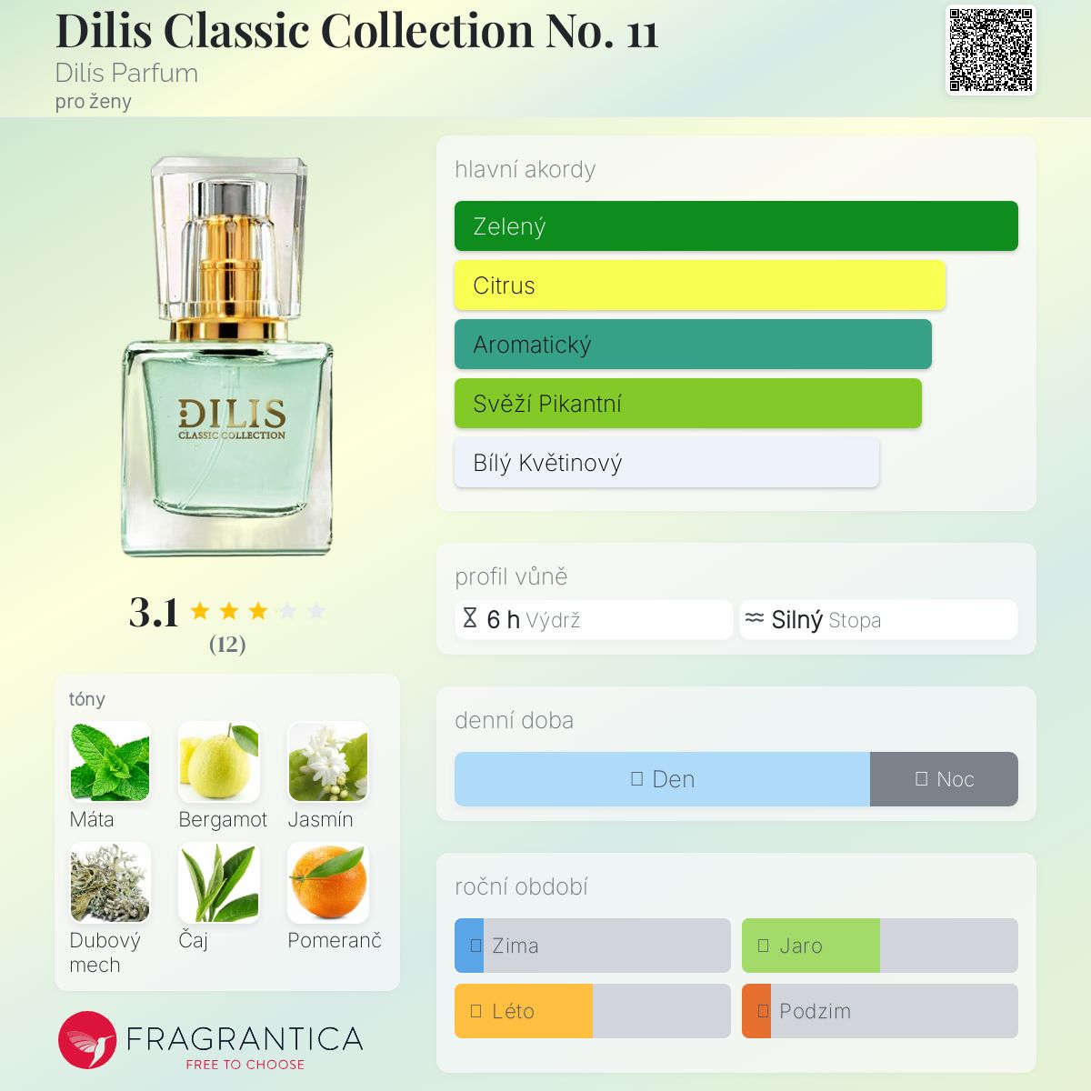 Dilis Classic Collection No. 11 podle Dilís Parfum je Floral Fruity vůně pro ženy. Dilis Classic Collection No. 11 byl/a uveden/a v roce 1998. Vrchní tóny jsou Máta, Bergamot, Pomeranč, Citrón a Rebarbora; střední tóny jsouJasmín, Dubový mech, Karafiát, Pižmo a Bílý jantar (ambra) ; základní tóny jsou Zelený čaj, Jasmín, Dubový mech, Tymián, Jantar (ambra), Pižmo, Karafiát a Celer.