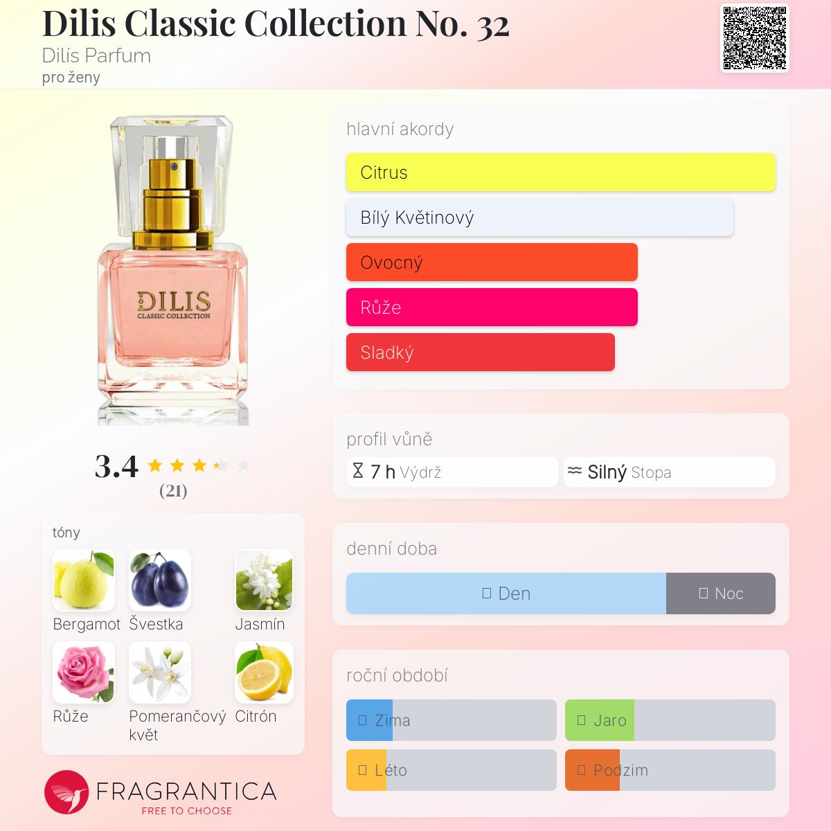 Dilis Classic Collection No. 32 podle Dilís Parfum je Floral vůně pro ženy. Dilis Classic Collection No. 32 byl/a uveden/a v roce 2015. Vrchní tóny jsou Bergamot, Švestka a Citrón; střední tóny jsouJasmín, Turecká růže a Pomerančový květ ; základní tóny jsou Pižmo a Pačuli.