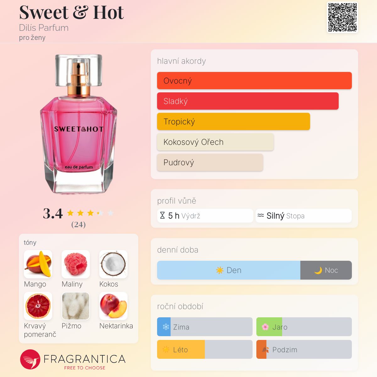 Sweet & Hot podle Dilís Parfum je Floral Fruity vůně pro ženy. Sweet & Hot byl/a uveden/a v roce 2015. Vrchní tóny jsou Mango, Krvavý pomeranč a Nektarinka; střední tóny jsouMaliny, Star apple, Lotus a Leknín ; základní tóny jsou Kokos, Pižmo a Santalové dřevo.