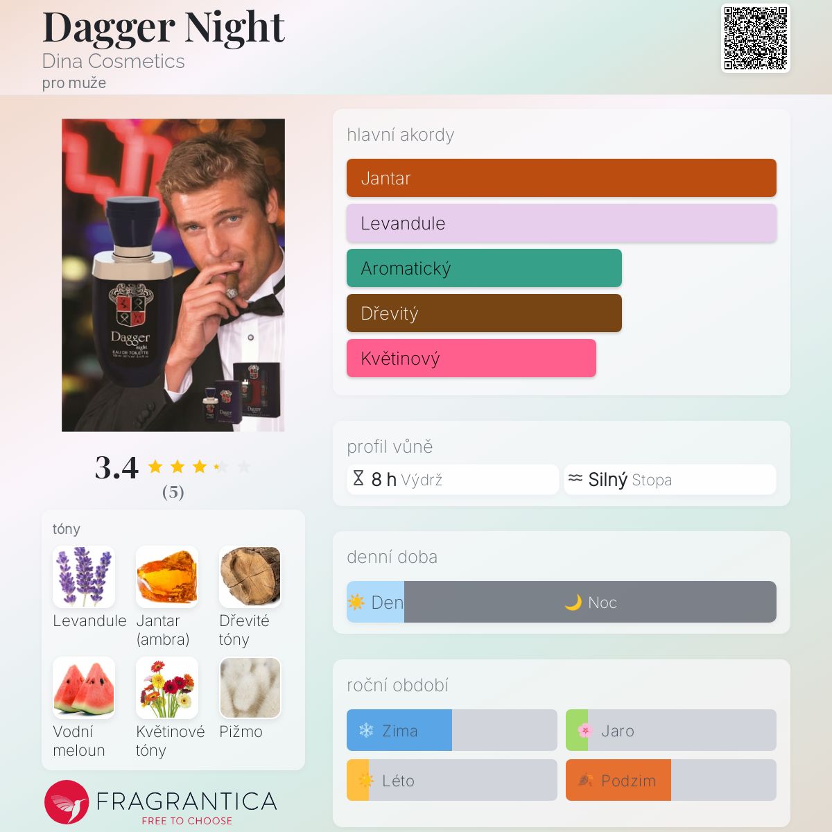 Dagger Night podle Dina Cosmetics je Aromatic vůně pro muže. Vrchní tóny jsou Levandule a Vodní meloun; střední tóny jsouKvětinové tóny a Zelené tóny ; základní tóny jsou Jantar (ambra), Dřevité tóny a Pižmo.