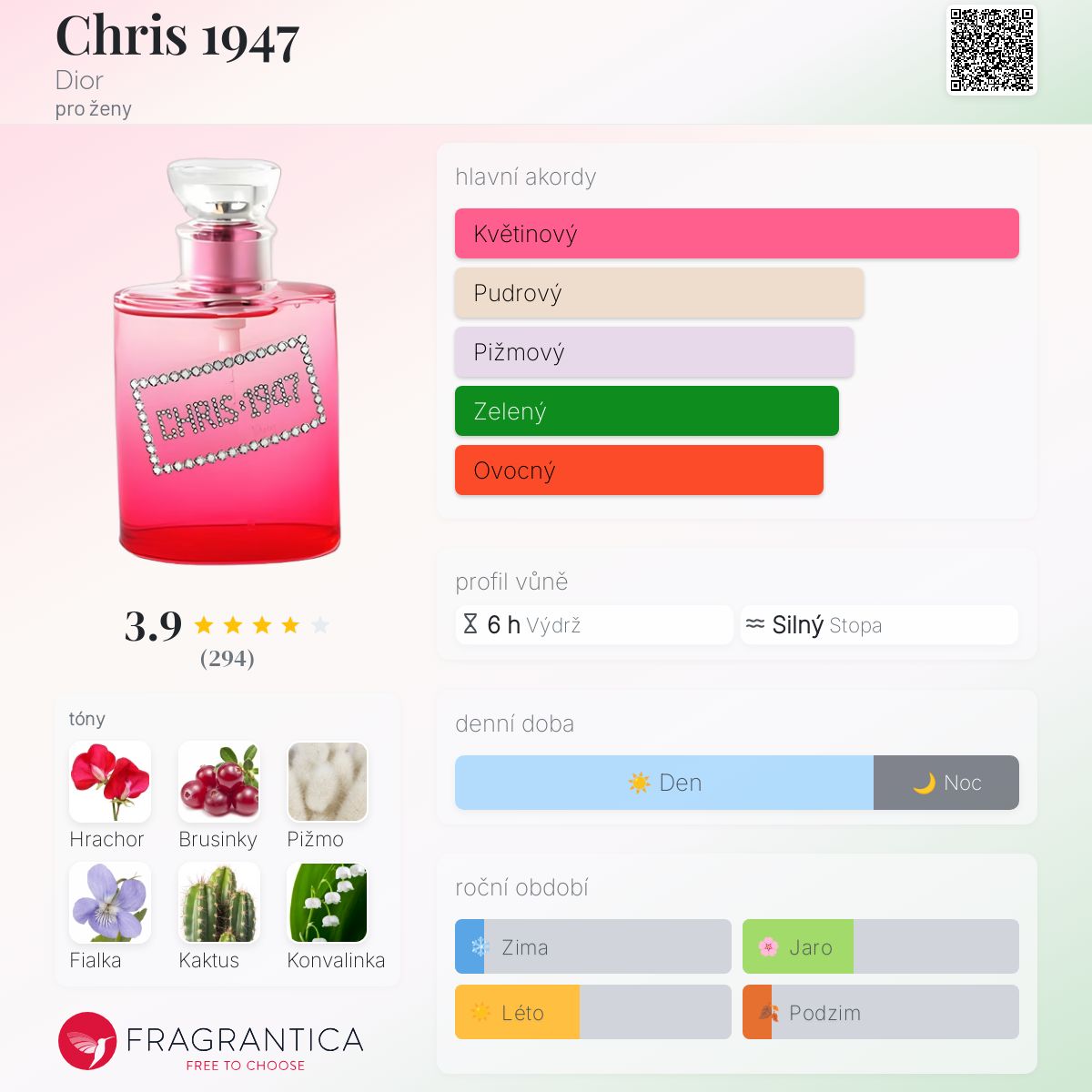 Chris 1947 podle Dior je Floral Green vůně pro ženy. Chris 1947 byl/a uveden/a v roce 2003. Vrchní tón je Brusinky ; střední tóny jsouHrachor, Fialka, Kaktus, Konvalinka a Frézie ; základní tón je Pižmo.
