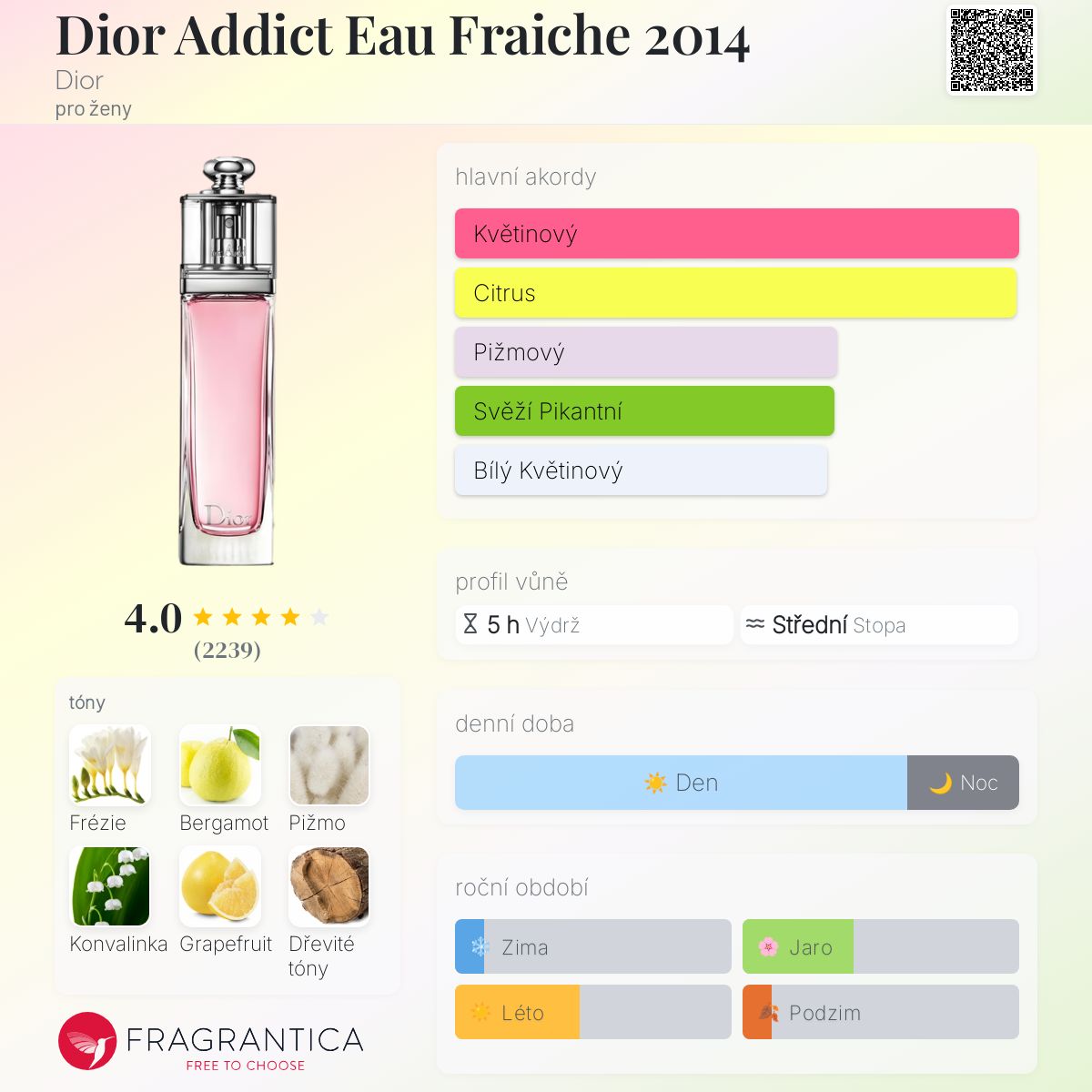 Dior Addict Eau Fraiche 2014 podle Dior je Floral vůně pro ženy. Dior Addict Eau Fraiche 2014 byl/a uveden/a v roce 2014. Vrchní tóny jsou Kalábrijský bergamot a Grapefruit; střední tóny jsouFrézie a Konvalinka ; základní tóny jsou Bílé pižmo a Dřevité tóny.