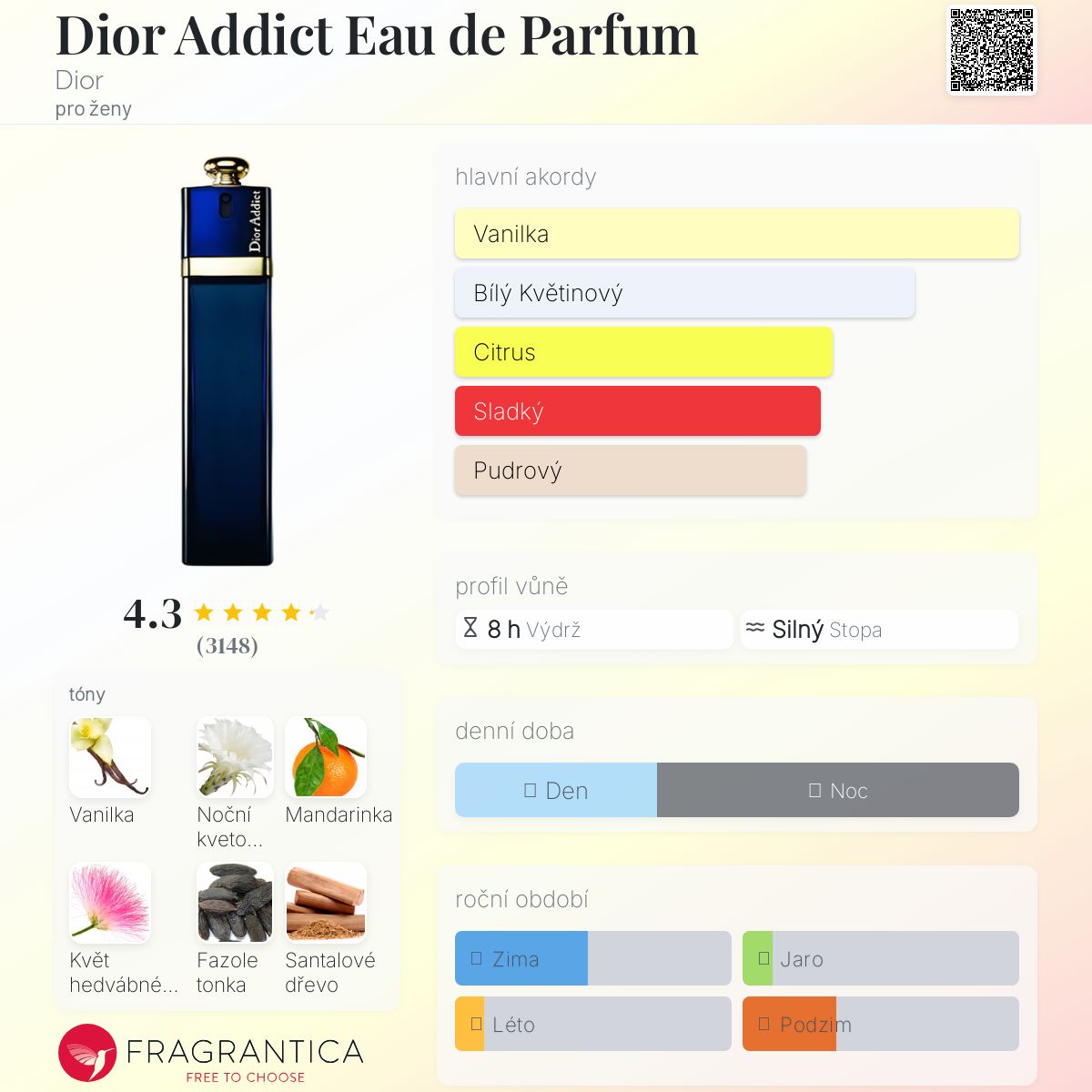 Dior Addict Eau de Parfum podle Dior je Orientální Floral vůně pro ženy. Dior Addict Eau de Parfum byl/a uveden/a v roce 2012. "Nosem" za touto vůní je François Demachy. Vrchní tóny jsou Mandarinka, Květ hedvábného dřeva a Pomerančový květ; střední tóny jsouNoční kvetoucí cereus (kaktus) a Bulharská růže ; základní tóny jsou Vanilka, Fazole tonka a Santalové dřevo.