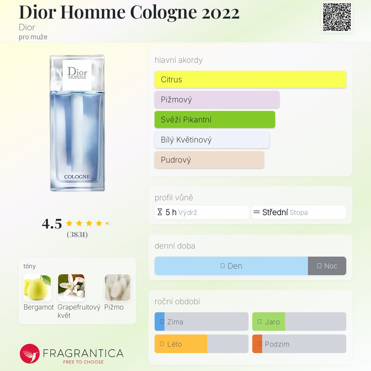 Dior Homme Cologne 2022 podle Dior je Citrus Aromatic vůně pro muže. Dior Homme Cologne 2022 byl/a uveden/a v roce 2022. "Nosem" za touto vůní je François Demachy. Vrchní tón je Kalábrijský bergamot ; střední tón jeGrapefruitový květ ; základní tón je Bílé pižmo.