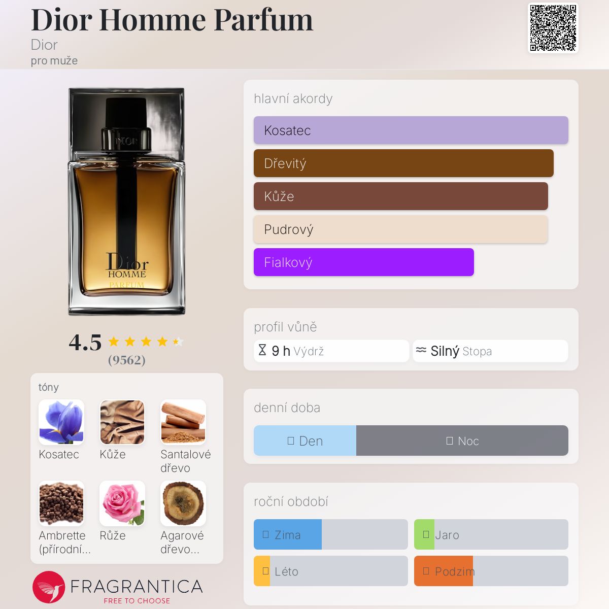 Na rozdíl od Dior Homme Intense, která je celá o kosatci, koko a rtěnkovém tónu, nebo jak by mnozí řekli, voní jako kosmetická taštička, Dior Homme Parfum tak nevoní a to je dobře, protože by to bylo jen zbytečné.