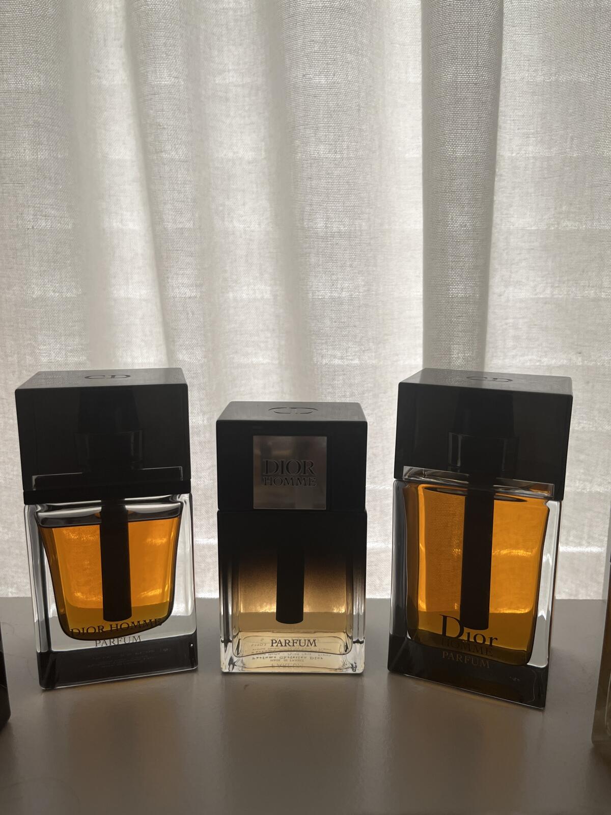 Dior Homme (EdT): Průzračnější (než DHI a DHP), jasná kosatcová a "metrosexuální" vůně (jak mnozí zmiňují). Dior Homme Intense (Dior Homme Intense): Silnější, hlubší vůně s kakaem a kosatcem (tón rtěnky/make-upu).