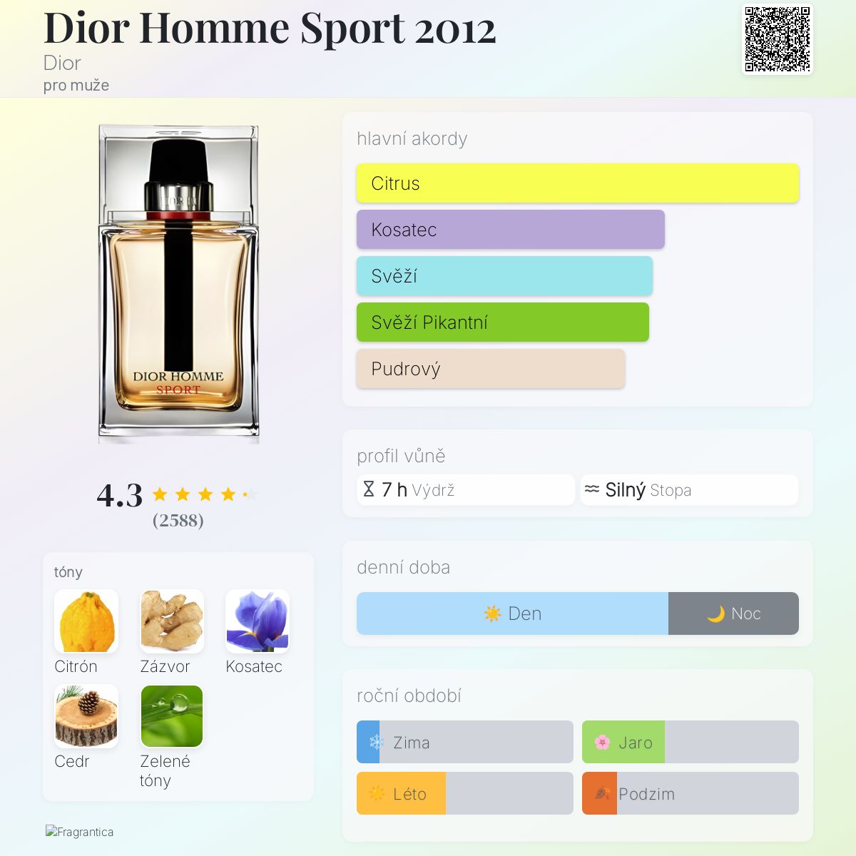Dior Homme Sport 2012 podle Dior je Woody Aromatic vůně pro muže. Dior Homme Sport 2012 byl/a uveden/a v roce 2012. "Nosem" za touto vůní je François Demachy. Vrchní tóny jsou Zedrát a Květ zázvoru; střední tón jeKosatec ; základní tóny jsou Cedr a Zelené tóny.