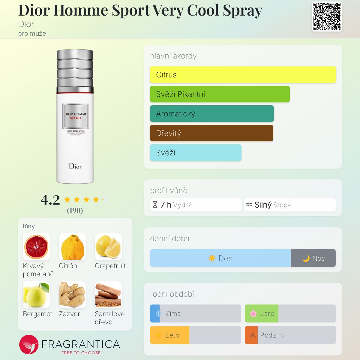 Dior Homme Sport Very Cool Spray podle Dior je Woody Aromatic vůně pro muže. "Nosem" za touto vůní je François Demachy. Vrchní tóny jsou Krvavý pomeranč, Zedrát, Grapefruit, Bergamot, Rozmarýn, Levandule a Hruška; střední tóny jsouZázvor, Růžový pepř, Elemi a Muškátový oříšek ; základní tóny jsou Santalové dřevo, Haitský vetiver, Cedr, Vanilka a Jantarové dřevo.