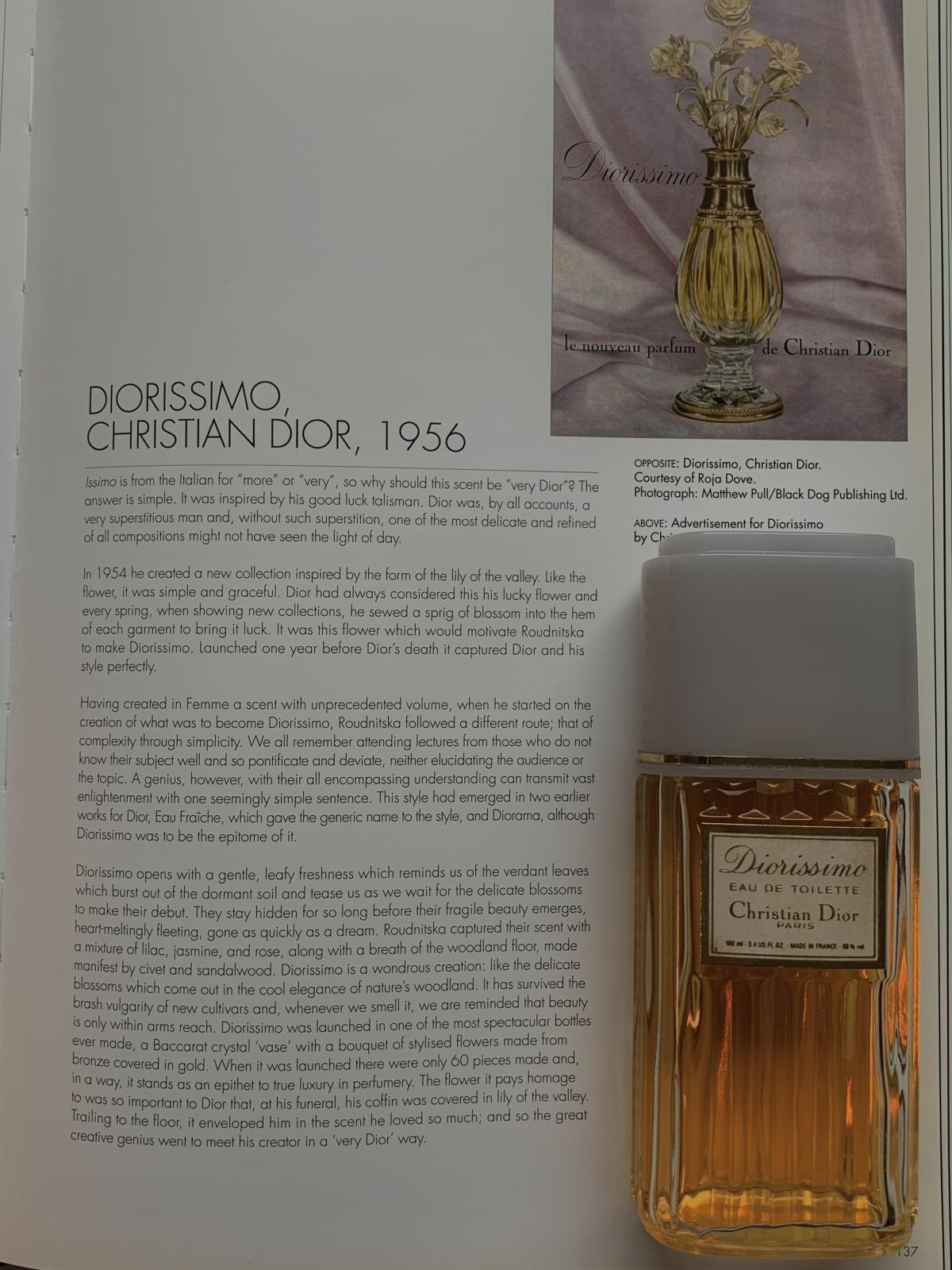 Diorissimo podle Dior je Floral vůně pro ženy. Diorissimo byl/a uveden/a v roce 1956. "Nosem" za touto vůní je Edmond Roudnitska. Vrchní tóny jsou Zelené listí a Bergamot; střední tóny jsouKonvalinka, Šeřík, Jasmín, Lilie, Ylang-Ylang, Amarylka, Rozmarýn a Boronia ; základní tóny jsou Cibetka a Santalové dřevo.